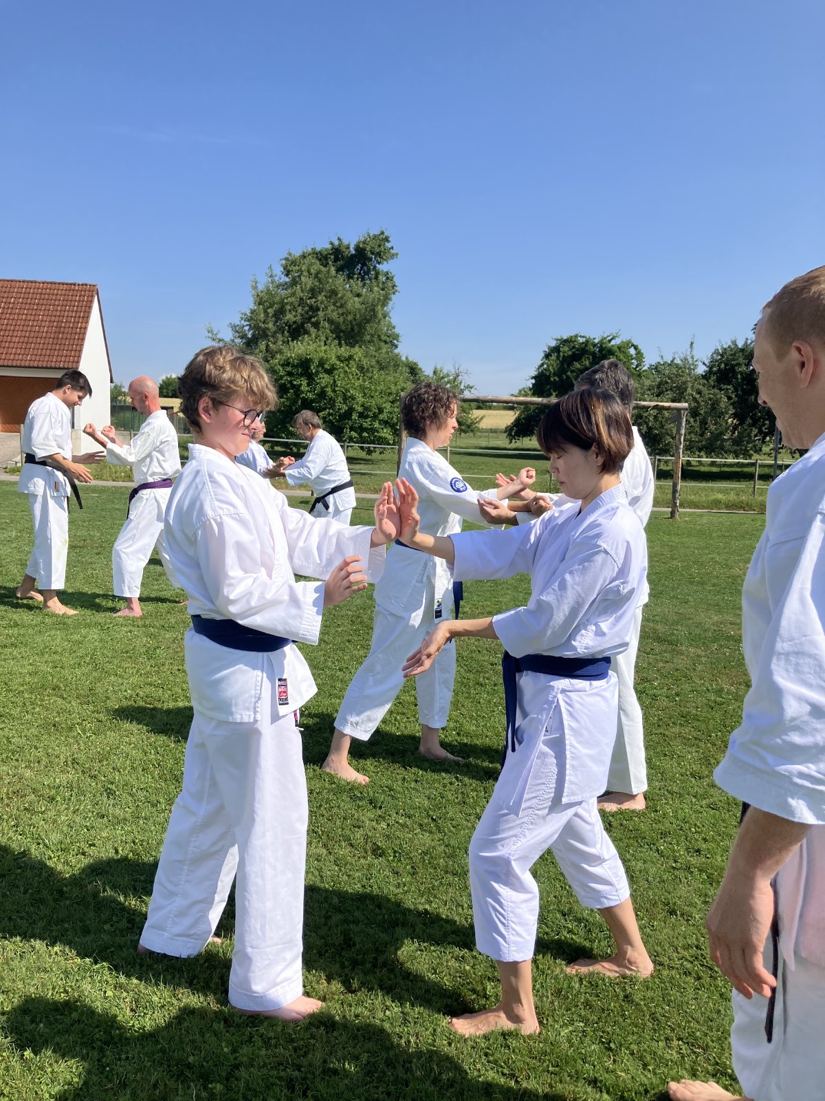 Bild: Petra KitaDieses Mal wurden die Lehrgänge von vier Lehrern geleitet. Am Freitag begannen wir mit einem praktischen Training mit Waffen (Imitationen) von Michael Lohe Sensei von Horan Shūkōkai Schörzingen. Dieses Training war anspruchsvoll, und ich erkannte, dass es ein sehr wichtiges Training war. Am zweiten Tag, Samstag, brachte uns Manuel Ali-Tani Sensei morgens eine Übung zur Stärkung der Körperachse mit der Kata Sanchin bei. Nachmittags zeigte uns Max Franke Sensei praktische, aber auch theoretische Bunkai-Übungen (Analyse und praktische Anwendung der Kata) anhand der Kata Jitte. Am Sonntag brachte uns Sabine Kita Sensei bei, wie wir uns mit der Kata Tenshō entleeren können, um die Kata natürlich ausführen zu können, ohne unser Selbstgefühl zu verlieren.